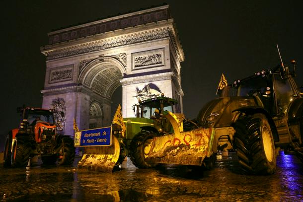 Dozens of tractors arrived before dawn and drove through Paris, some pausing at the Eiffel Tower and others at the Arc de Triomphe, in a protest organised by the Rural Confederation union.