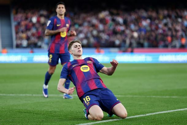 Barcelona midfielder Fermin Lopez celebrates scoring his team's third goal in the comfortable win over Levante on Sunday in La Liga