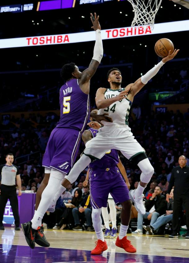 Milwaukee's Giannis Antetokounmpo scores on a layup in front of Deandre Ayton in the Bucks' NBA victory over the Los Angeles Lakers