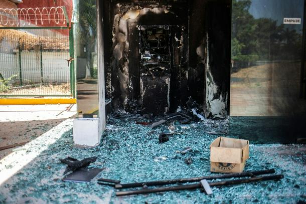 A burnt ATM of the state-owned Bank 'Banco del Bienestar' is pictured after a wave of violence in the town of Aguililla, the birthplace of drug kingpin Nemesio Oseguera