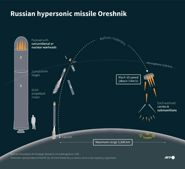 The Oreshnik is an intermediate-range ballistic missile that can be equipped with both nuclear and conventional warheads.