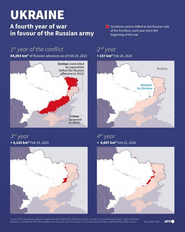 Kyiv (Ukraine) (AFP) - President Volodymyr Zelensky marked the four-year anniversary of the Ukraine war by accusing Russian counterpart Vladimir Putin of trying to take over Ukraine, saying he had failed to achieve this and other war goals.