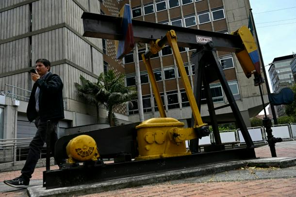 A man walks past a pumpjack outside the Bogota headquarters of Colombia's leading energy company Ecopetrol, which is planning pilot projects that activists say could harm the environment