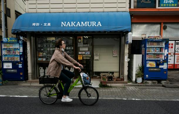 A woman cycles past two vending machines next to a clock shop in Tokyo's Bunkyo district on April 14, 2026