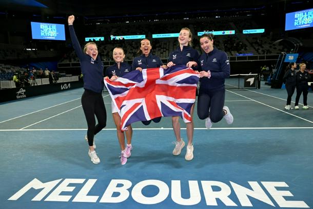 (L-R) Britain's Harriet Dart, Katie Swan, team captain Anne Keothavong, Mika Stojsavljevic and Jodie Burrage celebrate after beating Australia to advance to the Billie Jean King Cup tennis final