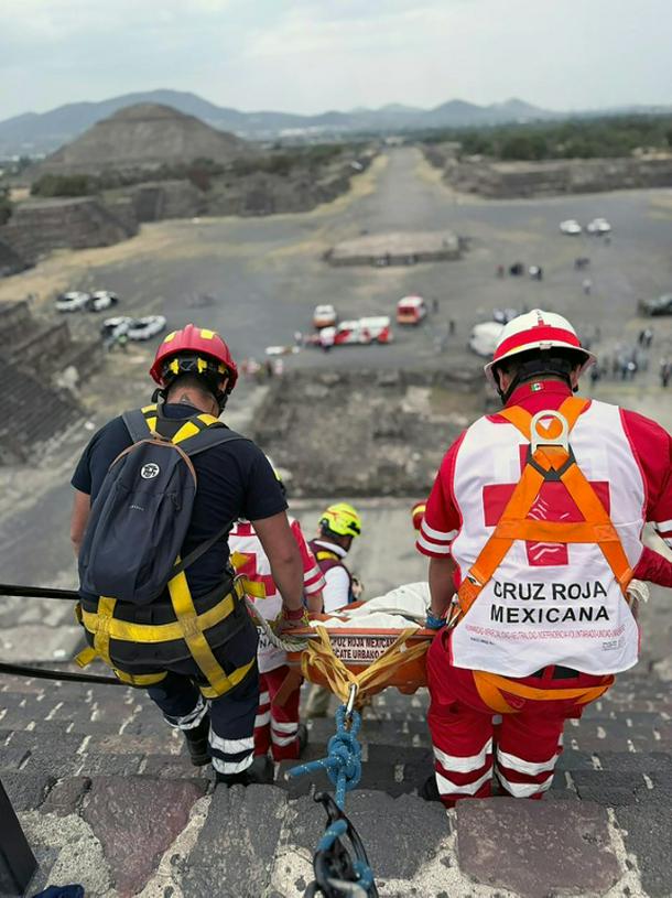 This handout picture released by the Mexican Red Cross shows paramedics assisting a tourist injured at the Pyramid of the Moon in the Teotihuacan