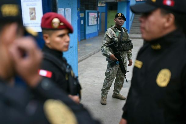 Police officers and a member of the armed forces stand guard at a school before its reopening as a polling station in Lima on April 13, 2026, after logistical failures prevented tens of thousands of people from voting in presidential and legislative elections the day before