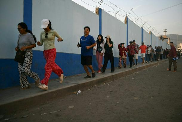People run to cast their votes at a school polling station in Pamplona Alta, in the San Juan de Miraflores district on the outskirts of Lima, on April 12, 2026. Hours-long delays marred Peru's presidential and legislative elections on April 12, as voters sought to end political chaos that has seen a string of presidents ousted or jailed.