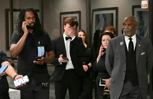 Attendees check their phones in the lobby of the Washington Hilton after shots were heard