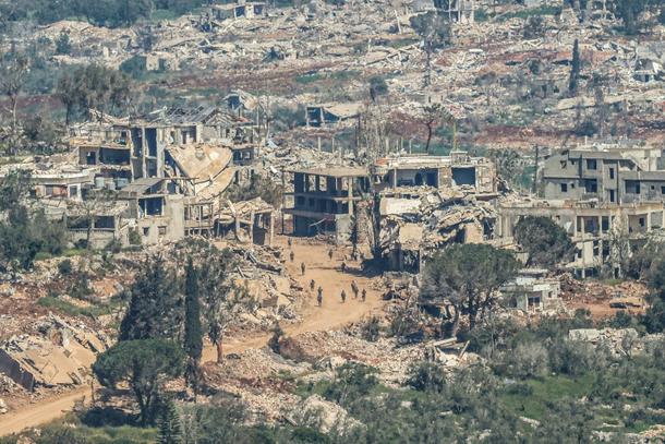 Israeli soldiers walking along the road between destroyed houses in southern Lebanon